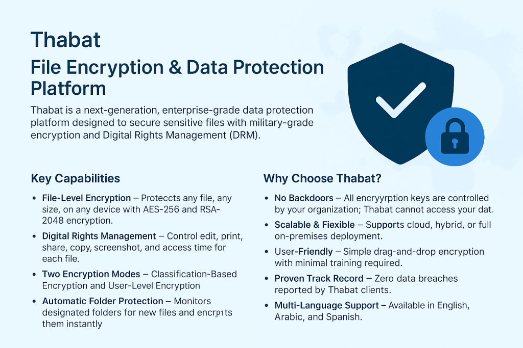 Thabat Will provide next-generation, enterprise-grade data protection platform designed to secure sensitive files with military-grade encryption and Digital Rights Management (DRM). Trusted by governments, banks, and enterprises, Thabat ensures data sovereignty, compliance, and complete control over your information — whether stored locally, shared externally, or in the cloud.