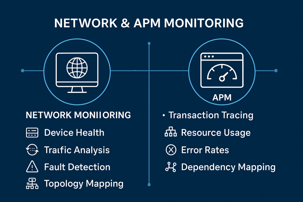 APM (Application Performance Monitoring) focuses on monitoring how applications perform from the user’s perspective, identifying slowdowns, errors, and bottlenecks across the application stack.